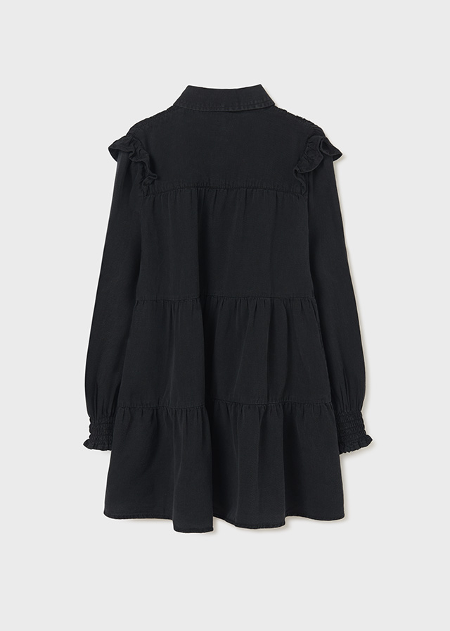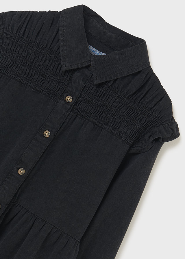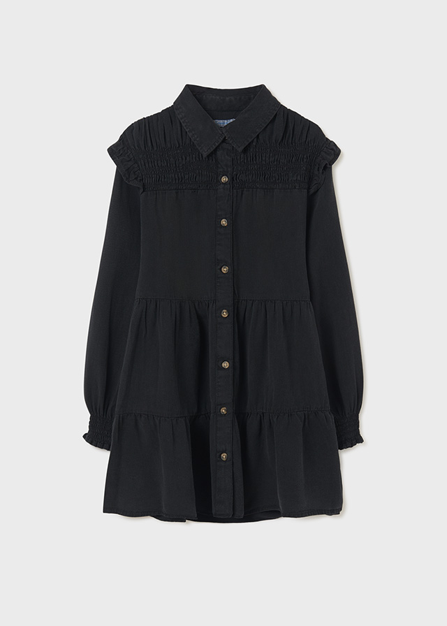 Sukienka jeansowa pochodzi z kolekcji Junior Dziewczyna jesień/zima 2022/23, dostarczonej przez firmę Mayoral. Model o luźnym kroju, został wykonany z miękkiego jeansu. Sukienka dla Junior Dziewczyny ma długie rękawy z marszczeniami, kołnierzyk i falbanki. Zapinana jest na guziki. Sukienka jeansowa dla Junior Dziewczyny jest idealna na codzienne stylizacje i na specjalne okazje.